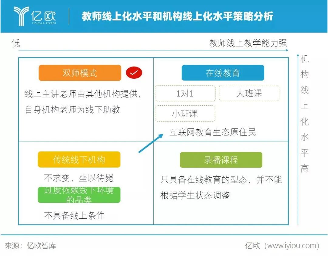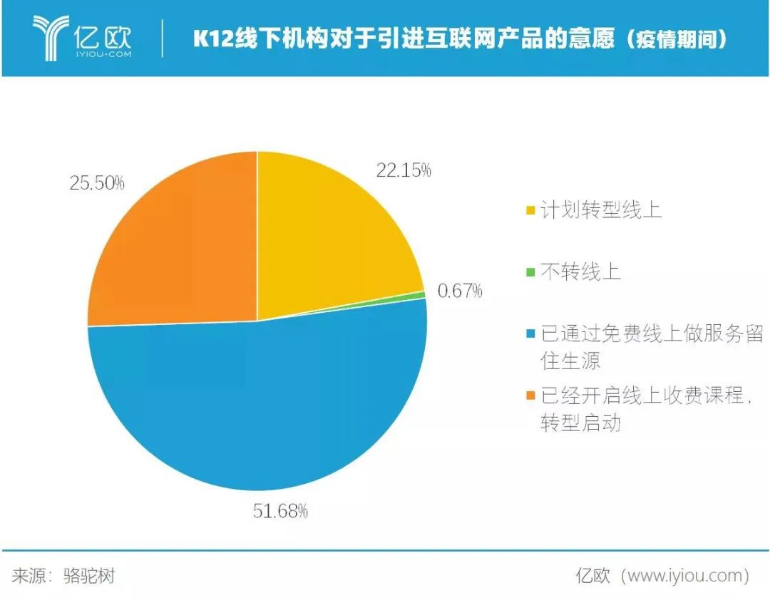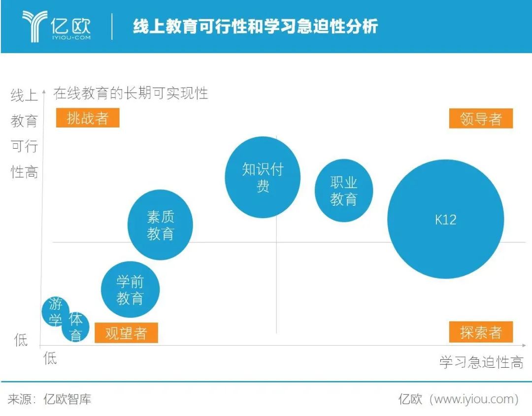 说明:此图从用户的角度出发,探讨机构教育方案的短期影响。游学体育类项目对于线下环境的高度依赖使得其始终无法将核心环节线上化。相比于其他品类,K12学生面临升学压力强刚需的特性,教培机构出现短时间大规模线上教学的变革。