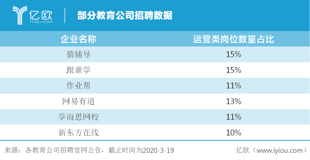 说明:从目前的招聘人数来看,各大在线教育公司对于运营相关岗位的需求仅次于研发,增长相关人才更是高薪抢夺。同时基于亿欧智库对线下机构的访谈,部分线下机构已开始筹划自己的线上运营团队。