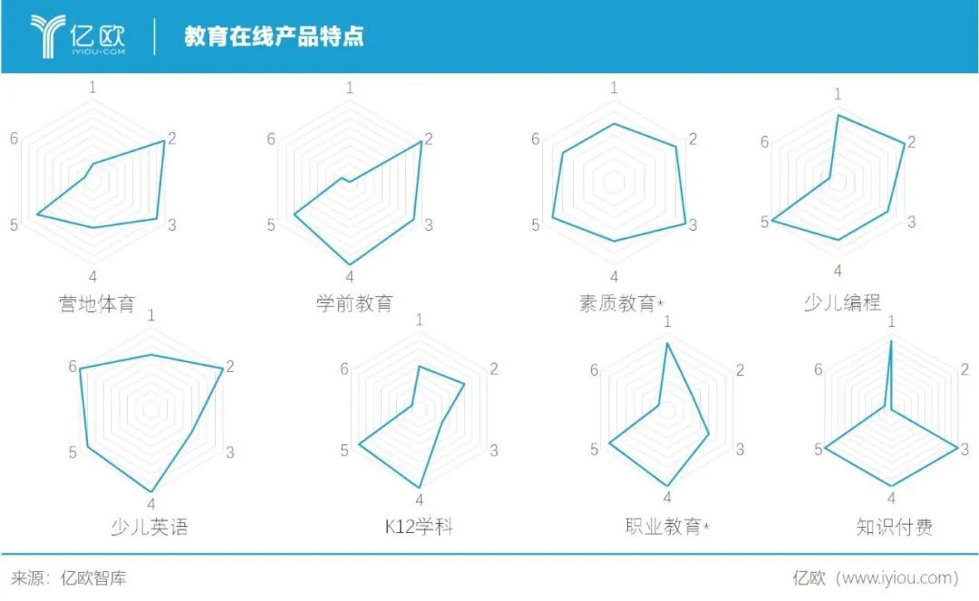 1得分越高代表用户的主观能动性越高,2得分越高代表对于教育的需求越强,3得分越高代表对于教学效果的容忍度越高,4得分越高代表课程越容易标准化,5得分越高代表对于内容原创性的要求越高,6得分越高代表线上线下的品质一致性越高。