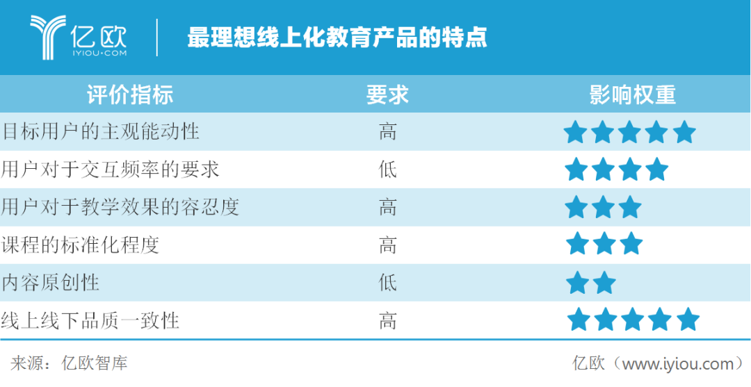 只讨论核心教学环节,亿欧智库认为可以从六个维度对不同品类线上化的优劣势进行评价。用户体验学习效果的角度包括目标用户的主观能动性: