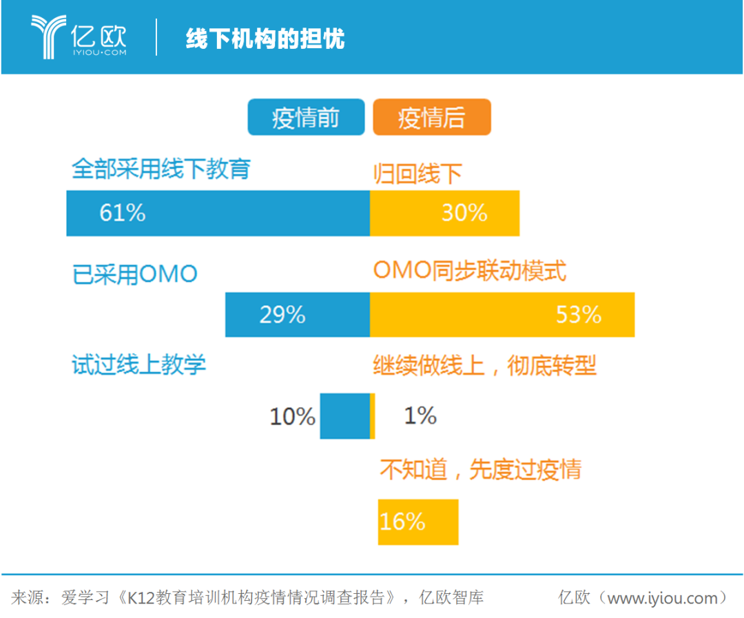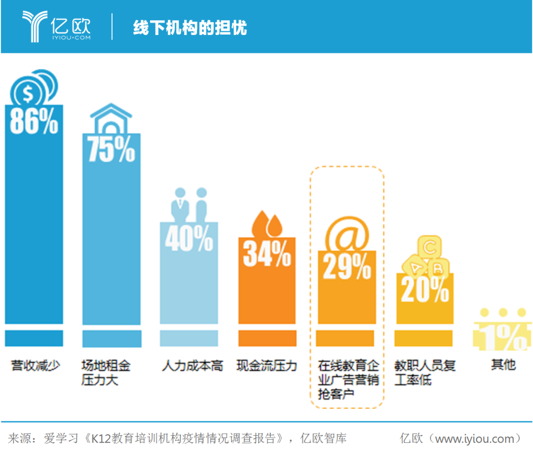 除了面对突发疫情的客观环境,对于近100万线下培训机构还面临着来自于同行的激烈竞争。根据爱学习的调研数据,29%的线下机构从业者坦言担忧在线教育企业通过广告营销争抢客户。