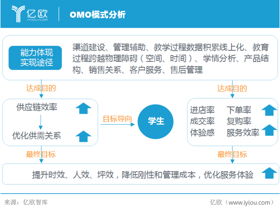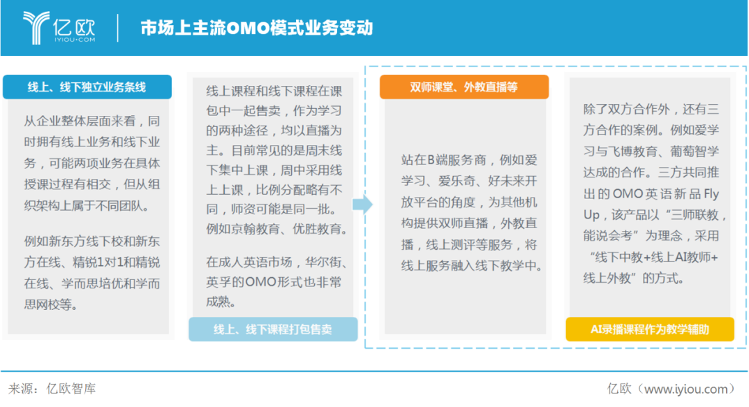 面对压力,机构的经营模式顺应调整,大力促进在线模式的普及。对于大部分线下机构而言,放弃原本的地面优势并不现实,所以兼顾线上线下的OMO更易被接受。OMO顾名思义Online-Merge-Offline,表示将线上线下相整合。