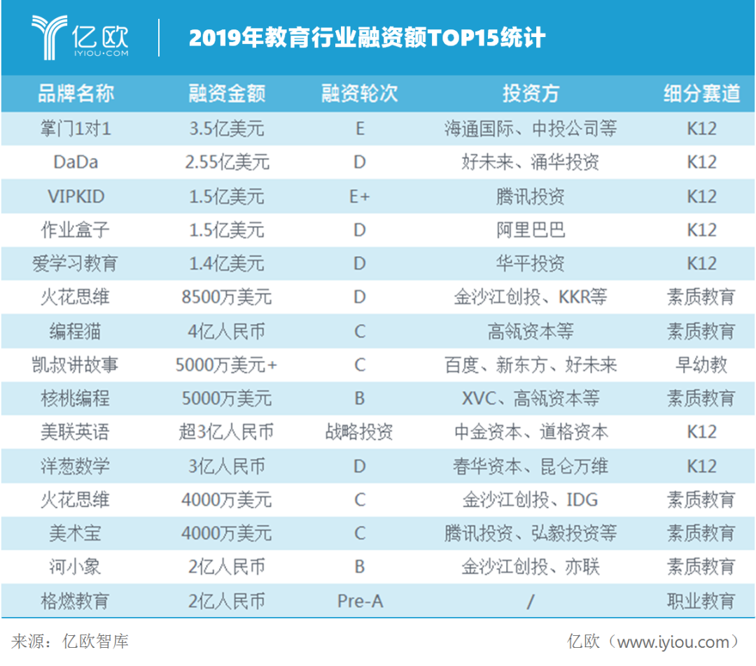 从2019年的数据来看,整个教育行业一级市场的投融资情况处于下滑趋势,这将对未来2-3年的可投资金额产生持续影响。同时,头部效应明显,明星企业一年内或多次融资,复投率提高。这表明,新教育企业想要获得好的资金更加困难。