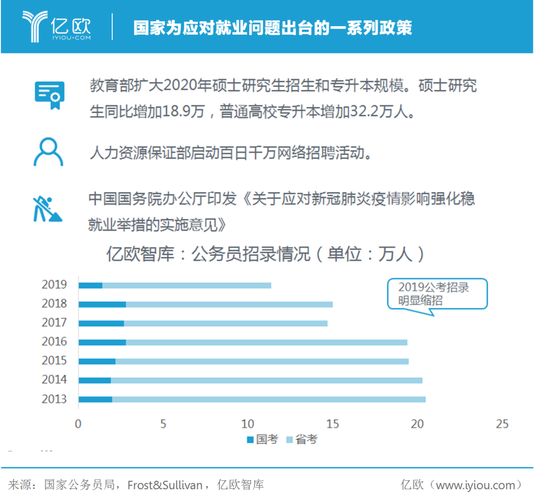疫情加剧经济增速放缓,2020年中国GDP增速由此前预期5.9%降至5.4%。随着世卫组织宣布COVID-19进入全球大流行状态,经济按下“暂停键”,就业市场已显现影响,行业普遍缩招。随后国家一系列稳就业政策相继出台,公务员、事业单位等铁饭碗可能重获青睐。