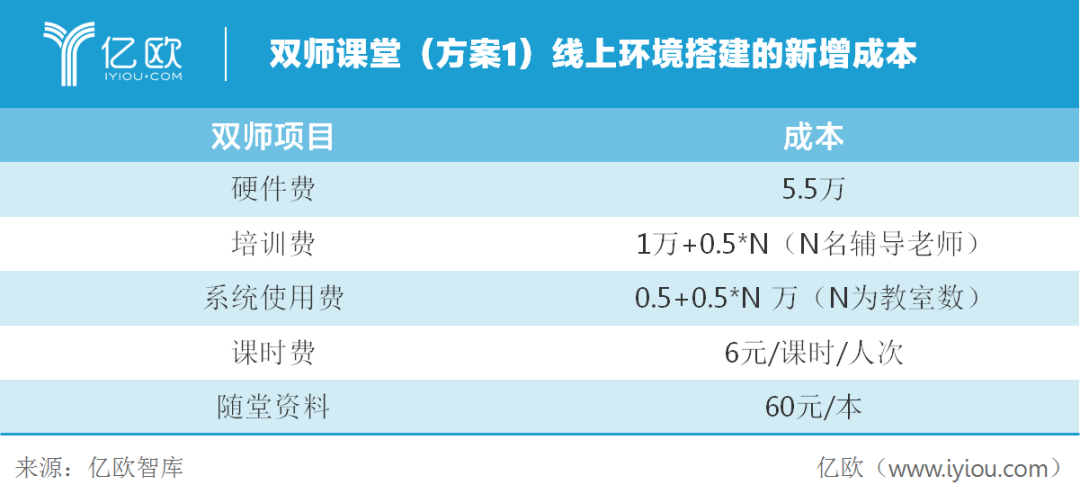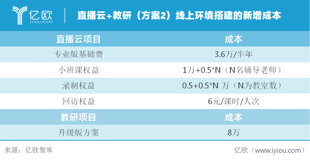 对于结合业务而言,要保证线下教学可持续,即学生人数的天花板已固定。假设该机构为运营正常的3-4线微型规模线下机构,年收入在2000万元左右,校区规模为6-7个门店,教师人数按100人估算,25%参与线上教学,以30人左右常规班模式来看,服务天花板在人次为2万人次,目前行业中较好机构的满班率在60%左右,目前服务学生1.2万人次。以购买某机构提供的双师课堂(方案1)和直播云+教研(方案2)为例,在不新开校区的前提下,粗略估计线上环境搭建的新增成本如下: