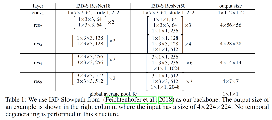 理论上,任何三维 CNN 结构都可以通过集成我们的 4D 卷积块投射到 4D CNN。如先前的工作所示,通过在较低层应用二维卷积和在较高层应用三维卷积可以获得更好的性能。在我们的框架中,我们使用了来自 Feichtenhofer 等人的 Slowpath 作为我们的 backbone,简写为 I3D-S。虽然最初的 Slowpath 是为 resnet50 设计的,但我们可以将其扩展到 I3D-S resnet18 进行进一步的实验。我们的 3D 主干的详细结构如表 1 所示。