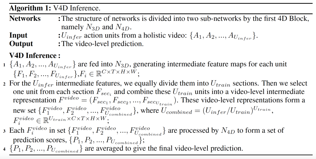为了进行公平的比较,我们遵循 Nonlocal 和 Slowfast 使用了 FCN Testing。我们从整个视频中均匀地抽取 10 个动作单元,用 3 个 256×256 区域对每个动作单元进行空间覆盖,然后进行 V4D 推理。注意,对于原始的 TSN,在推断期间使用 25 个片段和 10-crop 推理。为了公平比较 I3D 和 V4D,我们对 TSN 也应用 FCN Testing 这种 10 个片段和 3-crop 的推理策略。