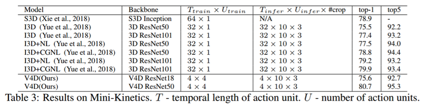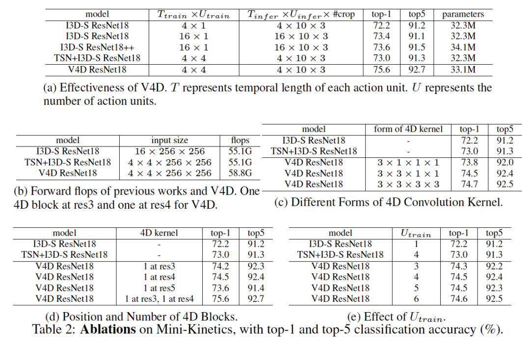 不同数量的动作单元。我们通过使用不同数量的动作单元来训练 V4D,使用不同的 U_train 参数值。本实验在 ResNet18 的 res4 末端插入 1 个 3×3×1×1 4D 块。如表 2e 所示,U_train 对性能没有显著影响,这表明:(1) V4D 是一个视频级特征学习模型,它对短期单元的数量具有鲁棒性;(2)一个动作一般不包含多个阶段,因此增加了无帮助。此外,动作单位数量的增加意味着第四维度的增加,这需要更大的 4D 内核来覆盖时空表示的范围演化。
