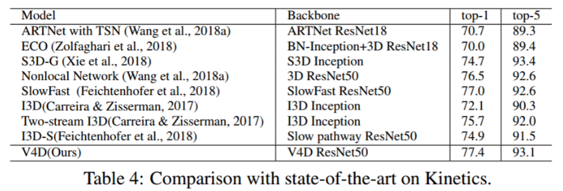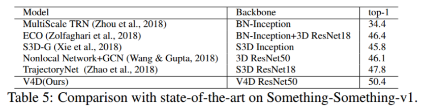 结果。与以前的作品相比,如表 4.4 所示,我们的 V4D 在Something-Something-v1 上取得了竞争性的结果。我们使用 Kinetics 预先训练的 V4D ResNet50 进行实验。