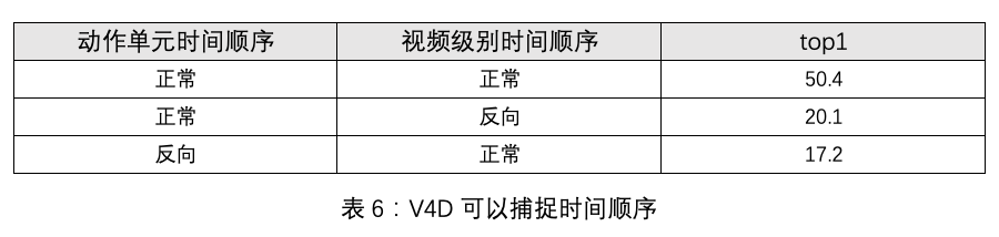 时间顺序。通过逆转时间,3D 模型的准确度显著下降,这说明 3D CNN 可以学习到非常强的时间顺序。对于我们的 V4D,有两个等级的时间顺序,短程的顺序和一个长程的顺序。如表 6 所示,通过反转每个动作单元内的帧或反转动作单元的序列,top-1 的精确度显著下降,这表明我们的 V4D 能够捕获长期和短期的时间顺序。