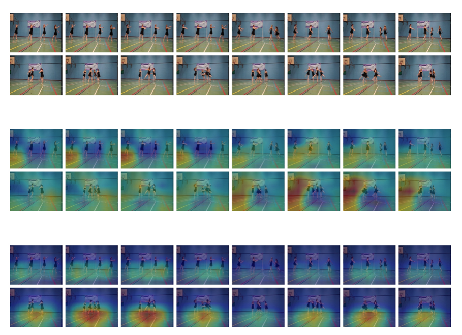 可视化的结果,第一行为 RGB 视频,第二行为 TSN+I3D-S, 第三行为 V4D