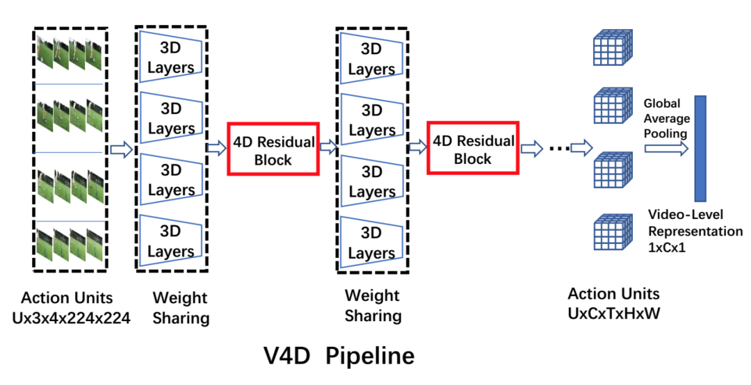 在这一部分中,我们介绍了一种用于视频动作识别的新型视频 4D 卷积神经网络,即 V4D。这是第一次尝试为基于 RGB 的视频识别设计 4D 卷积。现有的 3D CNN 以一个短期片段作为输入,没有考虑三维时空特征的演化来进行视频层的表示。尽管 Nonlocal Network 和 Compact Generalized Nonlocal Network 提出了对非局部时空特征建模的 self-attention 机制,但这些方法最初是为基于片段的 3D CNN 设计的。目前尚不清楚如何将这种操作纳入整体视频表示,以及这种操作是否对视频级学习有用。另外直接将 Nonlocal 应用于整个视频的计算量也比较高。我们的目标是设计一种计算量低而且容易优化的 long-term spatiotemporal model。在这项工作中,我们引入了残差 4D 块,并将 3D CNN 投射到 4D CNN 中,以学习 3D 特征的远程交互,从而得到“time of time”的视频级表示。