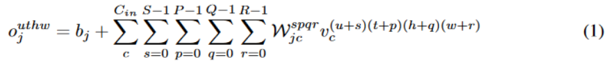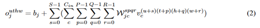 我们定义输入的尺寸是 (C,U,T,H,W),其中 C 是频道数量,U 是动作单元的数量,T、H、W分别代表每个动作单元的时间长度、高度和宽度。一个位于 (u,t,h,w) 的属于第 j 个频道的输出像素用来表示,4D 卷积可以被表示成