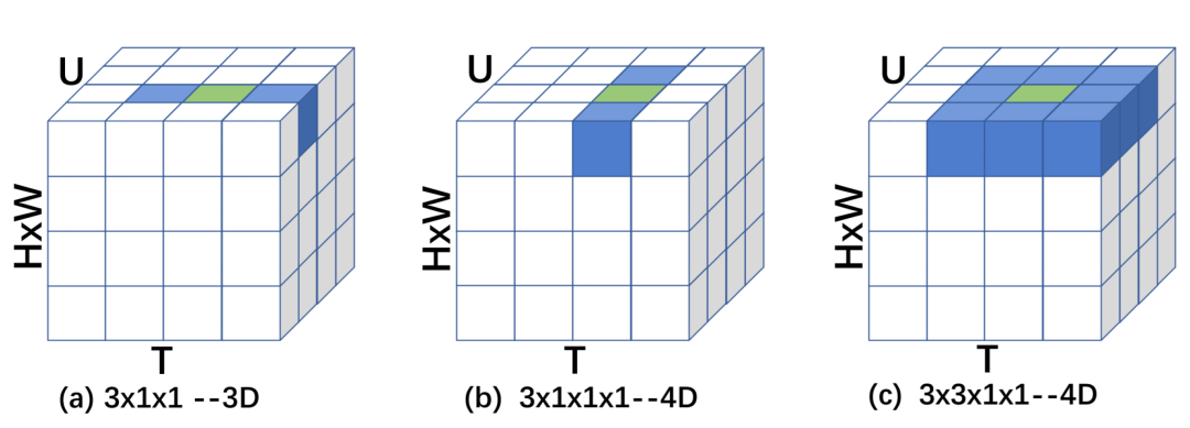 Figure 2: Implementation of 4D kernels, compared to 3D kernel s. U denotes the number of action units, with shape of T;H;W. Channel and batch dimensions are omitted for clarity. The kernels are colored in Blue, with the center of each kernel colored in Green.