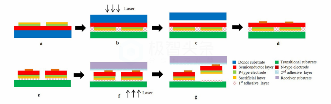激光选择性释放是利用材料对激光的不同吸收系数,引起界面的热膨胀,从而引起牺牲层的烧蚀,使micro-LED从原始衬底转移到接收衬底,如图5所示。(图3.5,引用Sony的专利。)若为GaN外延片,界面处的GaN缓冲层分解成Ga和N2,实现芯片的分离和转移。