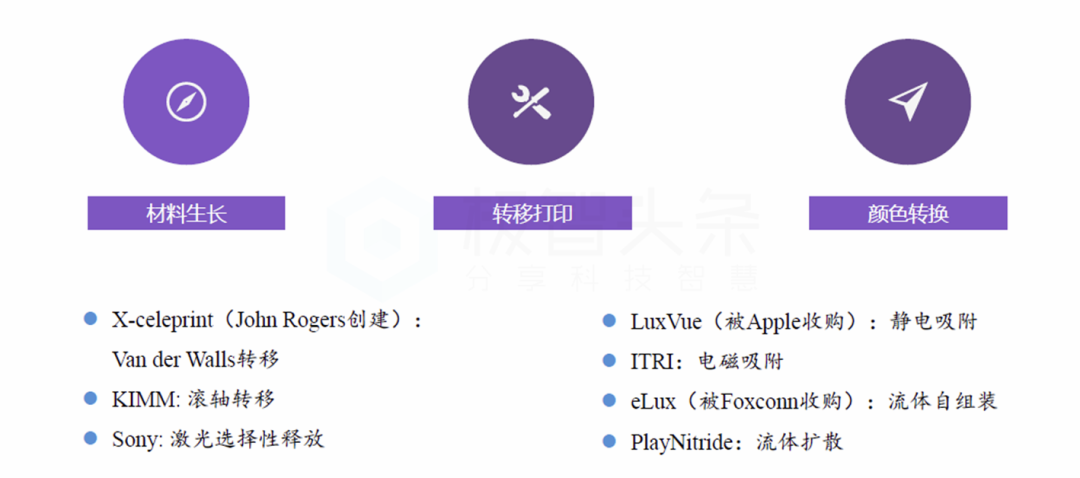 转移打印技术已被许多公司广泛使用,但是成本和产量是该技术发展的主要障碍。颜色转换技术可实现低成本和高PPI的micro-LED显示全彩化。然而,材料的能量损失、低效率和不稳定性仍然是需要进一步地解决。