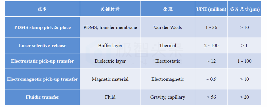转移打印是实现micro-LED显示全彩化的关键技术。自John Rogers教授团队利用PDMS stamp转移micro-LED,Martin Dawson教授团队实现纳米精度PDMS转移后,各大公司提出了不同的转移技术。本文根据大量论文、专利的知识,主要描述了范德瓦尔斯力转移打印、激光选择性释放、静电吸附、电磁力吸附、流体转移五种方法。表1显示了转印技术的典型参数,包括关键材料、作用力、UPH和适用芯片尺寸。以PDMS stamp拾取技术为例,UPH随着PDMS stamp的尺寸,像素密度和拾取周期的增加而上升。