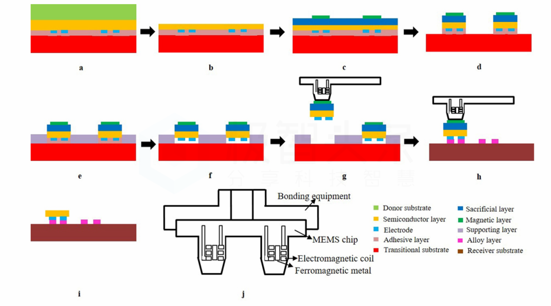 电磁力吸附转移技术有点类似于静电吸附转移,不同的是,该方法是通过线圈电感产生电磁力的方式,将micro-LED吸附及放下,如图3.7所示。(图3.7,引用ITRI的专利。)在拾取micro-LED阶段,主要方式为去除牺牲层,使其处于悬空状态,电可编程磁性模块产生磁力,吸附拾取芯片;在打印micro-LED阶段,电可编程磁性模块通过加热工艺将导电模块与接收器衬底对准并接触,从而将micro-LED与接收衬底键合。最后,断电消除磁力,拾取电可编程磁性模块。