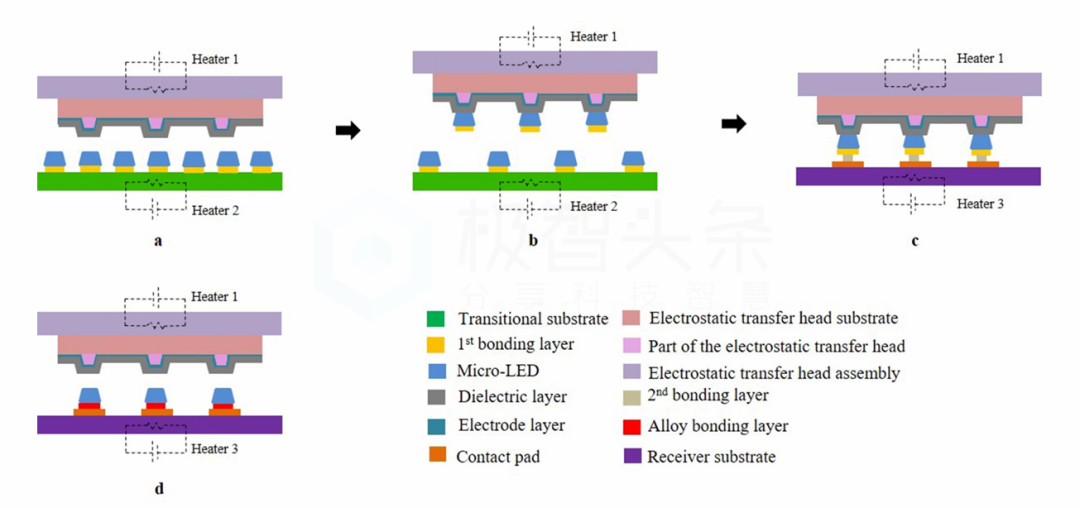 静电吸附是利用静电转移头产生吸引力或者排斥力实现对micro-LED的拾取和放置。(图3.6,引用Apple的专利。)在拾取micro-LED阶段,在吸附转移头和芯片上产生不同电荷,将micro-LED吸附拾取。在放置micro-LED阶段,通过调节内外电极电压差,使得电压差为零,将micro-LED放置到接收衬底。键合方式包括共晶合金键合、瞬态液相键合或固态扩散键合。
