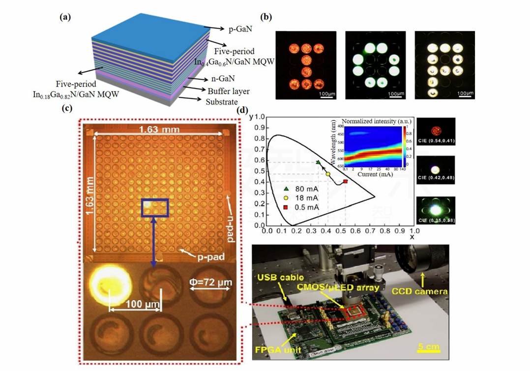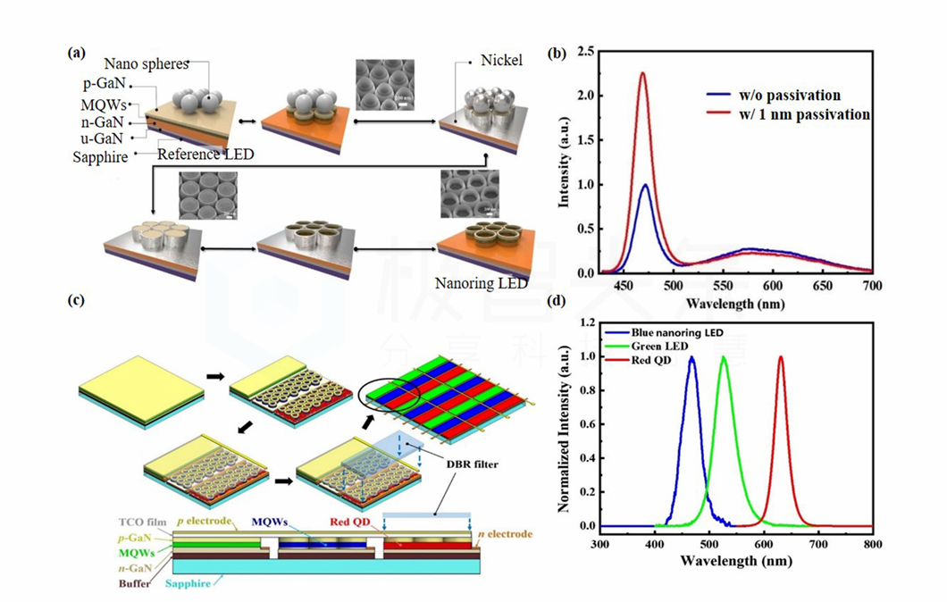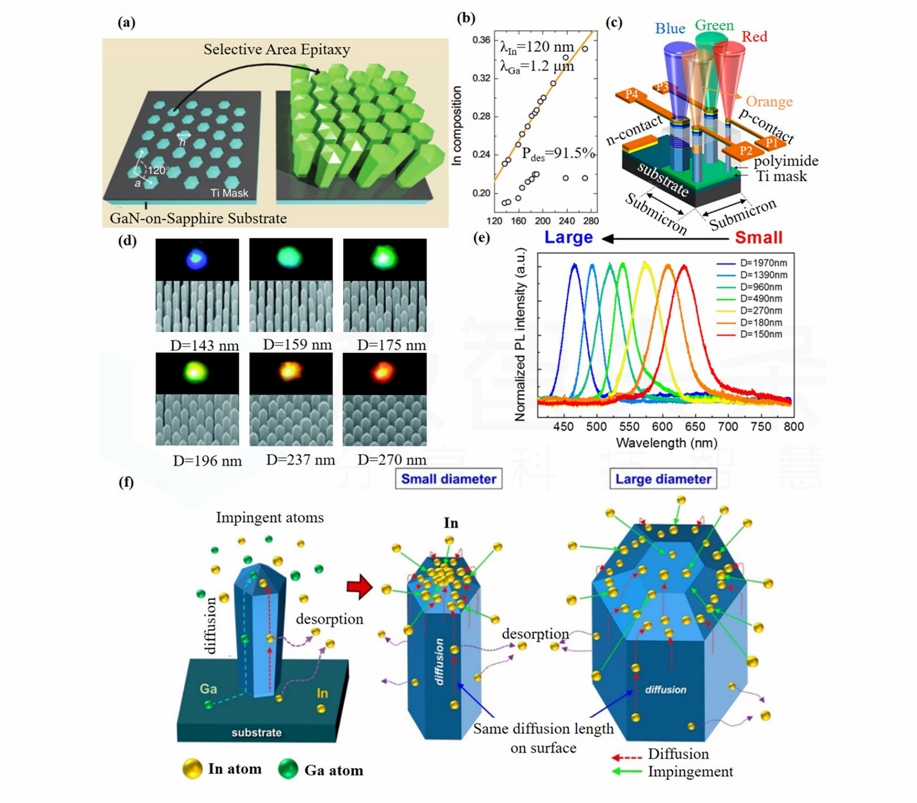 生长技术在结构和机理的研究上已经取得了很大的进展,这在高分辨率和高效率的micro-LED显示全彩化应用中有巨大的潜力。然而,驱动器与micro-LED阵列的集成以及效率的提高是该技术面临的巨大挑战。