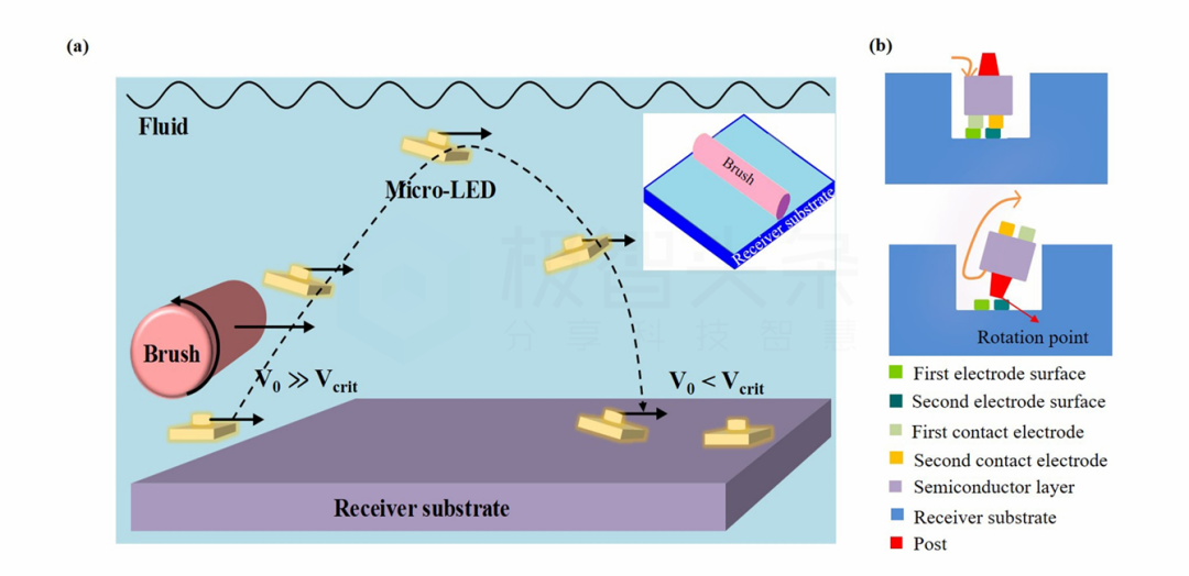 相比于上述提到的转移技术,流体转移技术的成本更低、速度更快。这种技术是利用刷子的移动来控制流体中micro-LED的运动,最后使它落入接收衬底的井中,如图3.8所示。(图3.8,引用eLux的专利。)当V0 ≫ Vcrit,,随着电刷的平移和旋转,电刷周围的流体产生湍流,因此许多micro-LED聚集在该区域中。首先,这些micro-LED被动地向上移动,并由于湍流而高速离开基板表面;接下来,刷子继续移动,驱动这些micro-LED开始在基板表面上向前散射,然后通过流体、振荡、减速,最后以低于Vcrit的速度沉入井中。