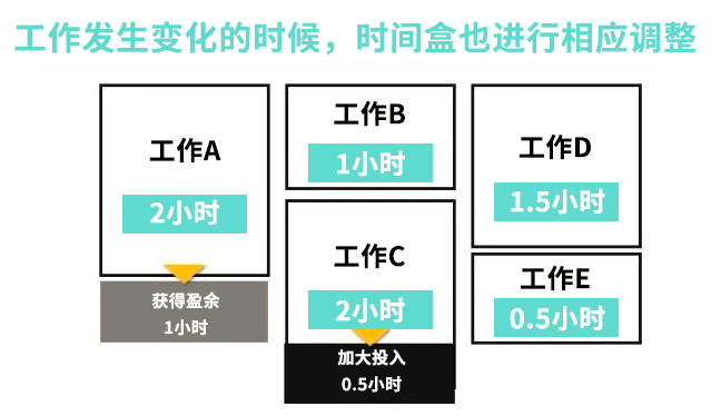 以上图为例,工作A实际需要花费的时间只要2小时,所以你就额外获得了1小时的空闲时间,相应的,A工作的时间盒就进行缩小。