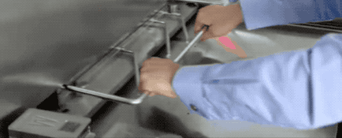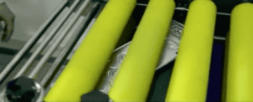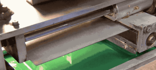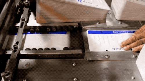 有小可爱可能会问,那如果是「白底黑字」或者「黄底黑字」的车牌该怎么办?总不能原来的车牌上贴合的是黑色反光膜吧...真不能,刷蓝墨换成其他颜色,冲压后多一个上色环节即可,下图是把车牌送入辊涂机中。由于制作视频是国外的,所以转辊上涂的是一层国内不这么用的蓝色油墨。在辊轮转动时与车牌的凸起面一接触,就把油墨印上去,而不会印错地方了。