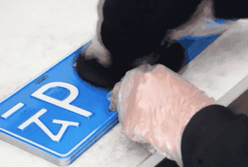 做「白字」的环节,想起来很难,实际操作是出乎意料的简单...就是用棉布沾上有机溶剂,在车牌上轻轻擦拭,由于有字的地方已经冲压凸起,此处的油漆就极易被溶在药水中,露出的「白字」 = 先前覆盖的白色反光膜,因此现形。