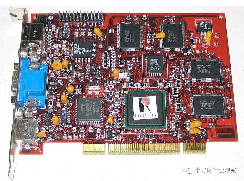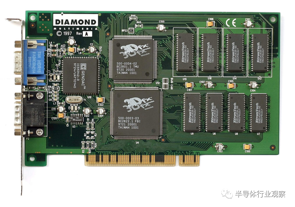 3Dfx的Voodoo于1996年11月推出,它由仅具有3D功能的显卡组成,该显卡需要将VGA线缆从单独的2D卡传递到Voodoo,然后再将其连接到显示器上。很多公司都出售过这种显卡。Orchid Technologies公司率先推出了售价299美元的“Orchid Righteous 3D”芯片,这款产品以其内置的机械继电器在芯片使用时能够发出“clicked”声而闻名。后来他们使用了固态继电器,与其他供应商保持一致。除此以外,基于Voodoo而设计的芯片还有:Diamond Multimedia的Monster 3D, Colormaster的Voodoo Mania, Canopus Pure3D, Quantum3D, Miro Hiscore, Skywell (Magic3D)和2theMAX Fantasy FX Power 3D。Voodoo Graphics几乎在一夜之间彻底革新了个人计算机中的图形处理器,超越了大量的仅能提供2D图形设计的供应商。1996年的3D环境使S3占据了大约50%的市场份额。据估计,在Voodoo统治的鼎盛时期,3Dfx占据了3D加速器市场80-85%的份额。但是,这种情况很快发生了变化。Diamond Multimedia的Monster 3D(3dfx Voodoo1 4MB PCI)大约在那个时候,VideoLogic开发了一种基于图块的延迟渲染技术(TBDR),该技术在纹理、阴影和光照应用于剩下的渲染之前,抛弃了所有可见的几何形状,从而消除了对大规模z缓冲(在最终渲染中去除遮挡/隐藏的像素)的需求。这个过程产生的框架被分割成矩形块,每个图块都可以自行进行多边形渲染并发送到输出。一旦计算了帧所需的像素并剔除了多余的多边形(z缓冲只在平铺层发生),对多边形渲染就开始了。这样,只需要进行最基本的计算。前两个系列的芯片和显卡由NEC公司制造,而第三个系列(Kyro)芯片则由ST Micro公司制造。第一张显卡只用于Compaq Presario PC,即众所周知的Midas 3 (Midas 1和2是基于arcade系统项目的原型)。PCX1和PCX2则作为OEM部件。系列2芯片最初用在了Sega的Dreamcast游戏机上。但是,到1999年11月桌面Neon 250上市销售时,它在169美元的价位上被无情地超越,败于更高分辨率的32位彩色显卡上。在Neon 250面世之前,Rendition的VéritéV1000成为第一张具有可编程核心的显卡,它使用了基于MIPS的RISC处理器和Pixel Pipelines(像素管线)。处理器负责设置和组织管线的工作负载。Vérité1000最初于1995年底开发,后来成为Microsoft用于开发Direct3D的主板之一。不幸的是,由于Rendition使用此方法需要在PCI接口上传输数据,因此该卡需要能够支持能够进行直接内存访问(DMA)的主板芯片组。与Voodoo Graphics上市之前的几乎所有其他消费类图形卡相比,V1000的表现都不错,后者的3D性能要高出一倍以上。该板相对便宜,并且提供了良好的功能集,包括包括为预算较低的游戏玩家提供edge反锯齿功能,以及ID软件的Quake的硬件加速功能。然而,游戏开发者们很快就放弃了DMA传输模型,因为这种方式不太受欢迎。与1996年一样,1997年被证明是消费类图形行业又一个繁忙的一年。ATI推出了Rage II,随后在3月份又推出了3D Rage Pro。后者是ATI 3D工程组(该小组成立于1995年)推出的第一张AGP 2x卡,这也是他们的第一款产品。Pro在4MB格式下几乎可以媲美Voodoo Graphics的性能,在使用8MB和AGP接口时,其性能则优于3Dfx卡。由于扩展了4kB高速缓存并增加了边缘抗锯齿功能,该显卡改进了Rage II的透视校正,纹理处理能力以及三线性滤波性能。还集成了一个浮点单元,以减少对CPU的依赖以及对DVD的硬件加速和显示支持。总而言之,Rage Pro大大增加了ATI的利润,帮助该公司实现了4,770万加元的销售利润,销售额超过了6亿美元。这种成功的大部分来自OEM合同,与消费者和服务器主板的集成以及移动版本。该卡的价格(通常以Xpert @ Work和Xpert @ Play的形式出售)也有所不同:2MB版本的170美元、4MB版本的售价在200-230美元之间,8MB版本则270-300美元之间。其16MB版本售价超过$ 400。ATI通过以300万美元的价格收购了Tseng Labs的IP来增强他们的产品组合,并于1997年12月聘用了该公司的40名工程师。这是一笔很划算的交易,但因为Tseng未能将RAMDAC整合到其显卡中,导致ATI销售额大幅下降,从1996年的1240万美元降至1997年的190万美元。3DLabs于1997年3月发布了Permedia(“Pervasive 3D”)系列板卡的修订版,该产品基于德州仪器的350nm制程,而不是之前其所采用的IBM的上一版本的Permedia制程和Permedia NT制程。第一个版本的性能低于标准,而NT型号则由于采用了全三角和AA设置的附加Delta芯片而有所改进,但它的价格达到了300美元。基于Permedia 2的卡已于年底开始发货,但它们并未与游戏重量级产品并驾齐驱,而是作为具有中等3D图形功能的半专业2D卡进行销售的。ATI和3DLabs更新产品线一个月后,Nvidia推出了RIVA 128(实时交互式视频和动画加速器),并通过渲染三角形多边形增加了Direct3D兼容性。Nvidia选择了与意法半导体进行合作,意法半导体使用新的350nm工艺生产了该芯片,并开发了RAMDAC和视频转换器。尽管最初的驱动程序存在问题(尤其是在虚幻引擎上),但该卡在Quake 2和3等游戏中表现出了足够的性能,超过了许多基准评测。Diamond Viper V330 PCI (Nvidia RIVA 128)这被证明是自1993年以来英伟达一直在寻找的具有里程碑意义的显卡。英伟达要想维持供应就需要把目光放得更远,这对于他们来说是未来经济和成功的关键所在。因此,他们与台积电签署了一项制造协议,与ST Micro一起供应Riva 128ZXs。在1997年底,Nvidia的3D图形市场份额估计为24%,仅次于3Dfx Interactive,排名第二,这主要归功于Riva 128/128ZX。即使最终合同给了NEC / VideoLogic,但Sega也将NV2纳入了Dreamcast 游戏机中可能采用的图形芯片中,这也增