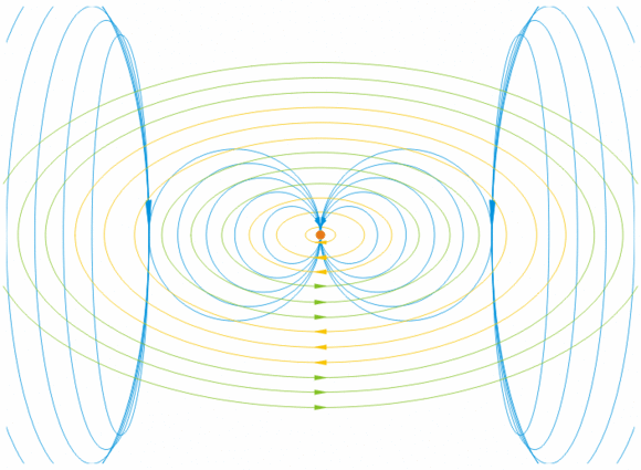 如果我们把它在三维空间中用矢量表示出来,就可以发现在远场处电场E和磁场H之间是相互垂直的。并且将两者叉乘以后,会形成一个向前传播的矢量。