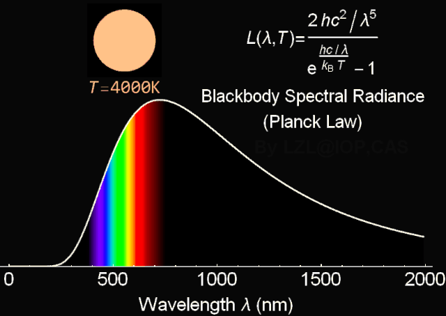 值得一提的是,人们在这个图中标注了一些白点,它们是在不同空间中,所定义的白色。而红色的这条线,是我们画出来的黑体辐射在图中的分布。我们注意到这些白色的点,总是围绕在黑体辐射这条线的周围,这其中蕴含了怎样的道理呢?具有特定温度的物体,可以发出比较宽范围的电磁波,当它温度越来越高的时候,会逐渐往可见光波段转移,直至更短的波段。普朗克黑体辐射公式描述了理想黑体,在不同温度下所辐射出的电磁波的强度分布。