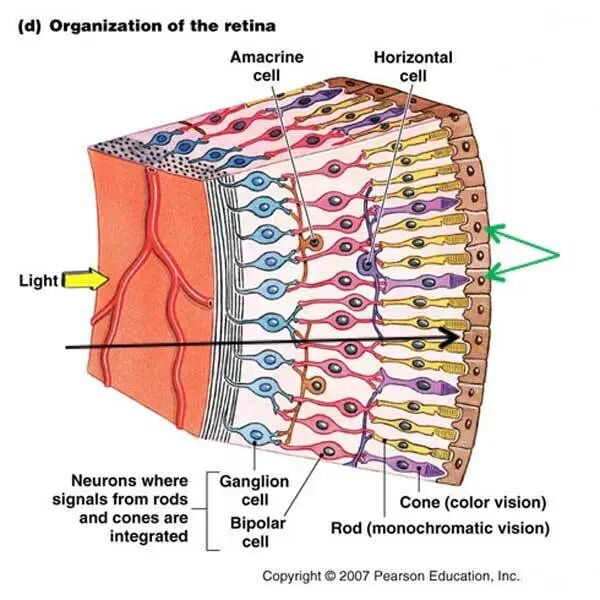 另外视网膜的生理结构上,你会发现它的层其实有点不科学,我们光先是通过了血管层 神经层,最后才到了感光层,这样会导致我们感光上,实际上受到前面的一些影子的影响。有意思的是,章鱼它的眼睛系统与人类恰好相反,光是先到达了感光层,所以它这方面有更好的视觉。