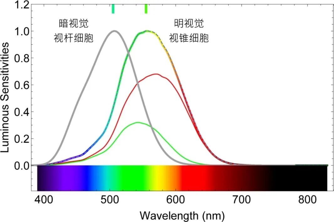 我们再来看一下视觉细胞是如何实现对亮度的感知的。下图所示左边这条灰色的曲线是暗视觉下,视杆细胞的感受曲线;右边彩色的曲线是明视觉下,视锥细胞的感知曲线。