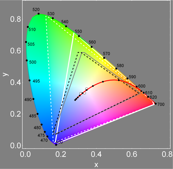 从上右图的色品图中,我们来看一下,可见光依然是存在在边界上的,而这个白色实线三角形的三个顶点,正好是汞灯的三个波长,所以汞灯所能表示的色彩范围,就是这个三角形内部框出来的区域。那么假如我们想要把色彩范围扩大需要怎么办呢?其实我们把其中这个绿色的光源,向更短的波长变化,用另一个波长的光去替换,变成白色虚线这个三角形,我们看到它所能表示的,颜色范围就更大了。另外图中这个灰色实线,和灰色虚线所示的分别是比色卡和常见的计算机里所使用的 RGB 空间。
