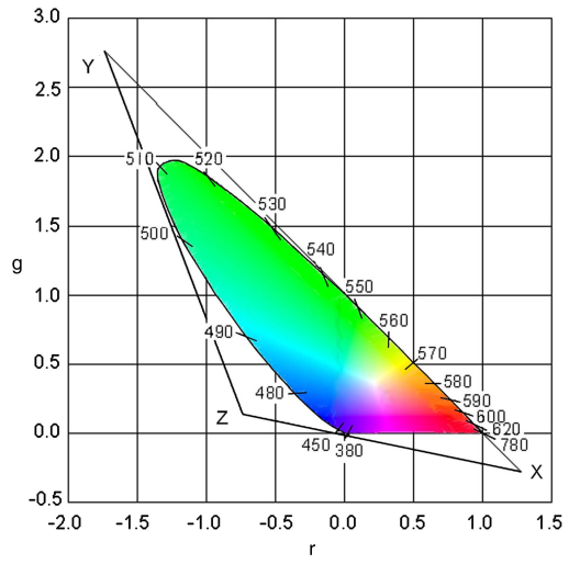 为什么CIE-RGB色彩匹配函数中会出现负数?有何物理含义?该色彩空间与一般的线性空间有何区别?