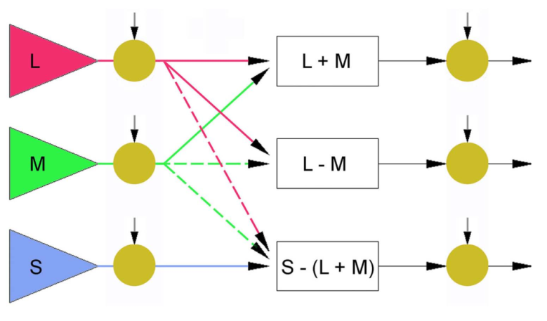 有意思的是右边这条线,可以由红色的色彩感知曲线和绿色的色彩感知曲线,通过一定的比例相加得到。这里面好像没有蓝色光什么事儿,其实就挖出来一件隐含的事情:我们眼睛视锥细胞在感受亮度的时候,是进行了一个计算的。比如说红色与绿色相加,它代表了亮度,对应一个黑-白色对;而红色与绿色相减,对应一个红-绿色对;红色加绿色变为黄色,蓝色与黄色相减呢,是一个蓝-黄色对;也就是说我们眼睛实际上在,最底层这一层面上,它是接受了蓝光,并且知道它的强度的,但是在初级神经这一段,它就已经进行了一个初步的计算,处理加工以后才上报给,更高级的神经系统。