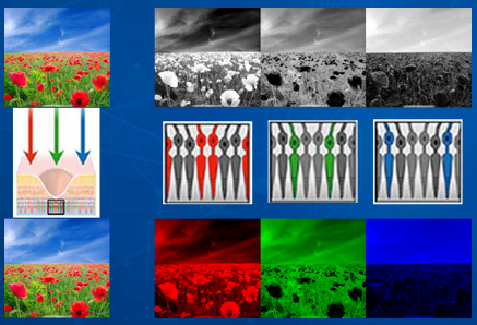 对于一个特定的单色光来说,比如说黄光附近,我们从这个频率升一条线上去,它会在三条曲线上各有一个交点,也就是说黄光对三个细胞,进行了不同的刺激。我们把这三个刺激加起来,就形成了对黄光的感知。从这个角度讲,我们的眼睛其实是一种“合成器”。因为它把光谱中很多很多的颜色,叠加起来之后形成了大概三类,而这三类又再一次叠加,形成较为整体的色觉感知。
