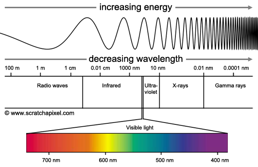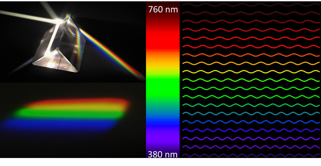 颜色从本质上来讲它就是频率,不过在客观的频率的基础上,我们又加入了人为的感知,这种主观因素,在牛顿的时代就已经发现,一束白光通过三棱镜进行分解,可以变为七种颜色,大致分为七类的光。但实际上这个光谱是连续地从 380 纳米到 760 纳米,从紫到红不断变化的,对应红橙黄绿蓝靛紫。