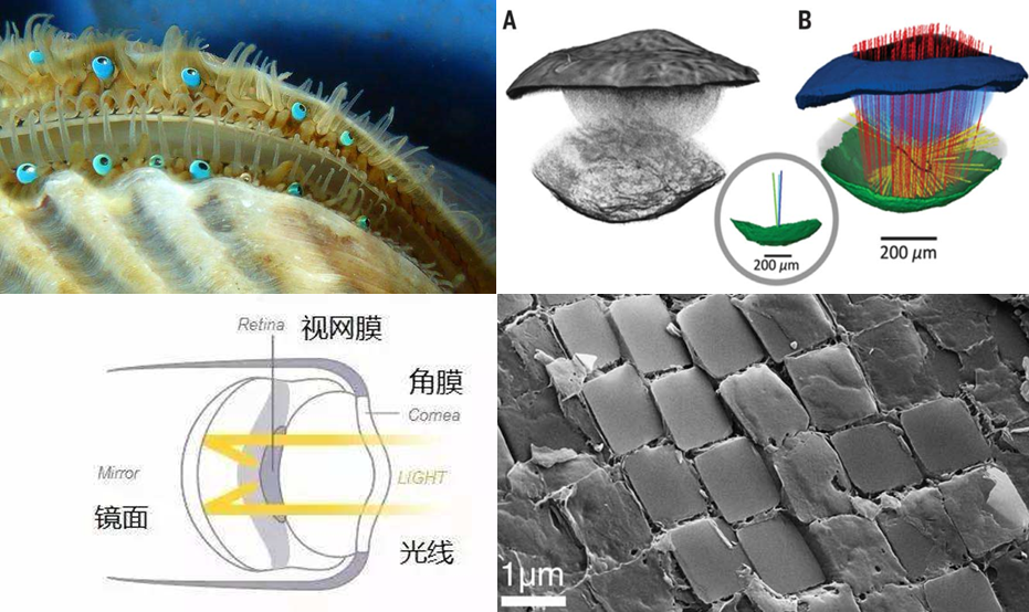 当然了色差是由于我们的人眼是透镜系统,反射式的系统就没有这个现象,我们动物中也确实有,采用反射方法来实现的,比如说扇贝。它的眼睛是靠底层一些嘌呤的结构形成的晶体的平面来反光,最后像反射式望远镜一样,成像到视网膜上。不过这个系统也有它自己的问题,这些微小的结构,尺寸大概在微米量级,有可能会导致衍射等其它不好的因素。
