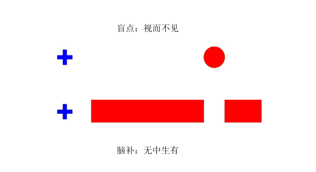 首先我们闭上左眼,用右眼睛去看蓝色的十字,当你前后移动、靠近和远离的时候,你会发现某个位置处,右边的红点突然不见了,这就是它落到了盲点上消失了,这叫“视而不见”。而另外一件事情,是我们盯下面的蓝色十字,用右眼去感觉右边红色,本来这个中间,是有一个白色的间断点的,但你挪到某一个位置的时候,恰好发现它连在了一起。这就不得了了,你会发现这里发生了一件事,叫做“无中生有”,这个东西其实是你“脑补”出来的,这就涉及到神经系统,所带来的各种心理因素了,同时会带来很多很多的错觉。