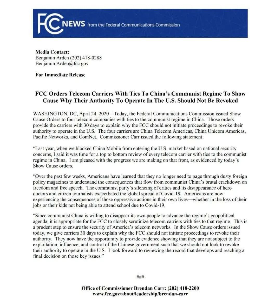 美国联邦通讯委员会(FCC)4月24日以国家安全为由,要求4家中资电信服务公司,即中国电信美洲公司(China Telecom Americas)、中国联通美洲公司(China Unicom Americas)、太平洋网络(Pacific Networks)及其子公司ComNet (USA)LLC在30日内说明为何不应吊销其在美业务运营资质的理由。