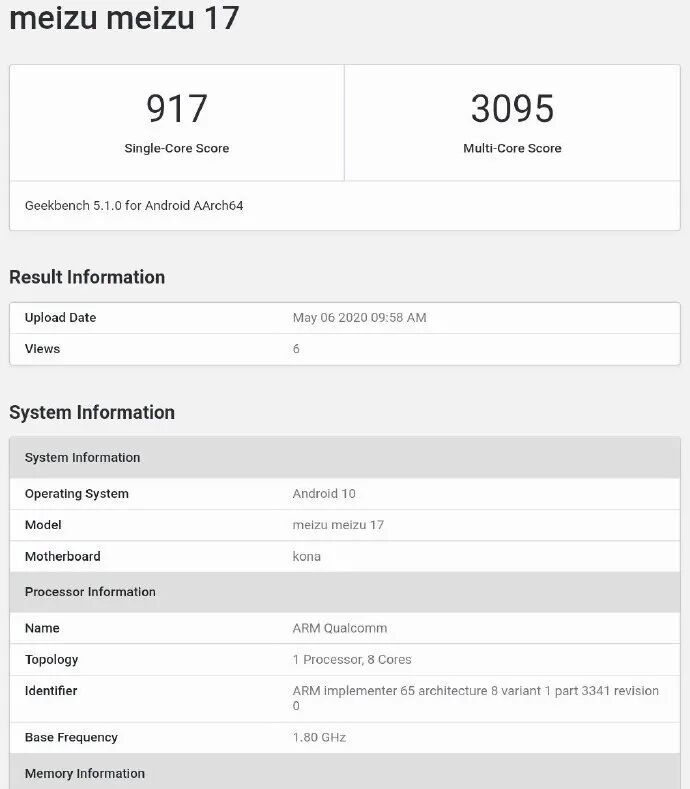 魅族 17 系列的 Geekbench 跑分来了,搭载骁龙 865 处理器。搭载基于 Android 10 的 Flyme 8.1 系统。标配 8GB LPDDR4x,高配 12GB LPDDR5。
