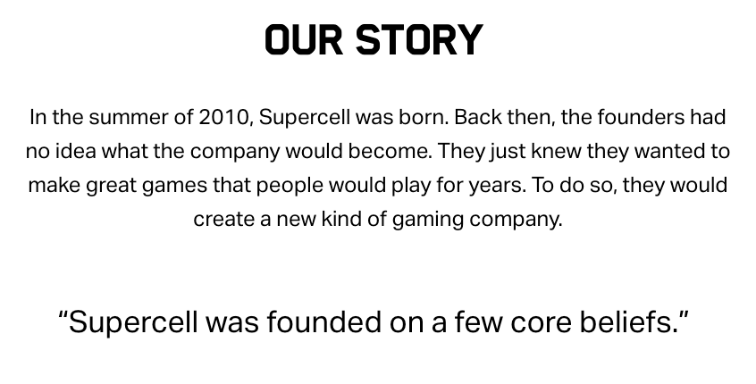 SuperCell 在创立之初,并没有特别清晰的要做的事情,只有一个愿景和几个笃信的信仰,其中很重要的三个信仰是: