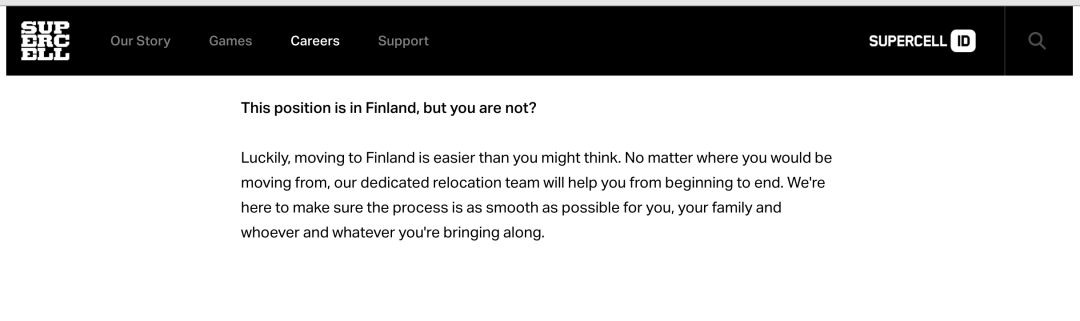 SuperCell 非常强调个体的能力,当然,人均产能几百万美元的经济实力,也让它有足够的资格雇佣全球最好的人才。在他们的招聘启示上写着:只要你应聘成功,无论你在全球的任何一个角落,公司都会负责把你和你的家人搬到芬兰。