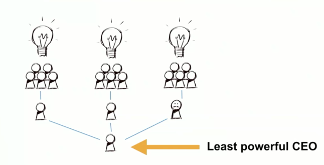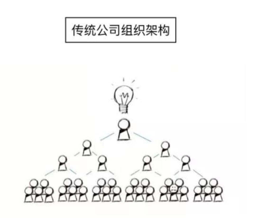 传统企业都是金字塔式的层级结构,CEO 是那个最聪明、最有权力的人,然后一层层管理着一个机构,最前线的执行者往往权力很小,也是被认为最可以被替代的资源。