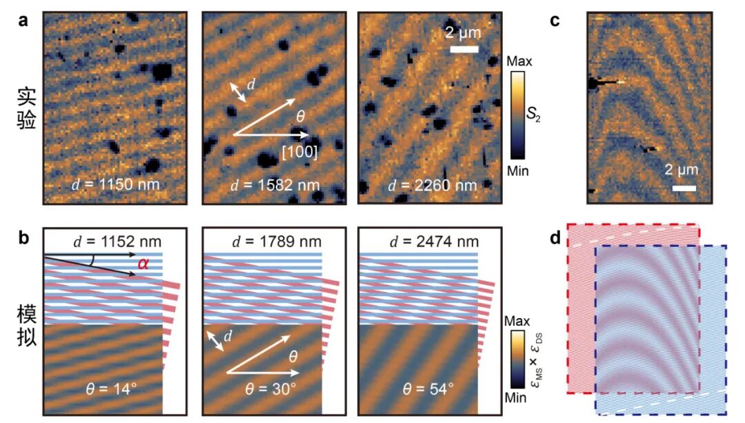 在LSMO体系中,导电性与应力之间有着非线性的依赖关系,所以调控效果非常显著。相比于二维范德瓦尔斯体系,在关联氧化物中通过应力工程实现的摩尔图案有着更丰富的可调谐性。通过对于其中一种应力势场周期的小幅度调节,可以实现摩尔纹周期、角度的大幅度改变(图6a),而模拟的结果也很好的复现了这一变化趋势(图6b)。另外,通过在应力势场中引入微小的曲率,可以实现更复杂的弯曲摩尔图案(图6c,d)。