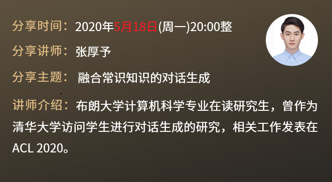摘要: 如何使开放域对话机器人生成包含知识的回答一直是对话生成领域的困难问题,也是很多学者一直在致力于解决的问题。本次分享,讲者将简单介绍对话生成领域的前沿进展和方向,并着重介绍ACL 2020关于如何在对话中融合常识知识的一篇工作。