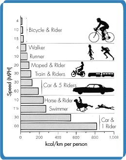 不同交通运输方式的能效对比,横坐标是每人每千米所消耗的卡路里,纵坐标是速度。 图片来源:exploratorium.edu