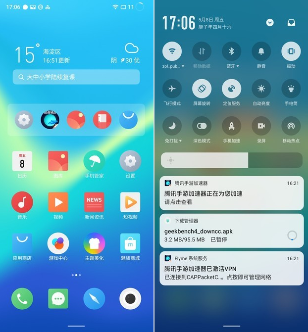 系统方面,魅族 17 使用了 Flyme 8.1 系统,圆滑方形图标设计,风格清新有活力,十分简约。上手后左右滑动较为流畅,反应比较灵敏。