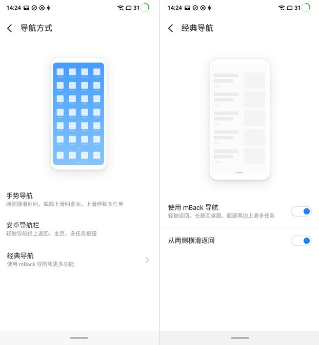 全面屏手势方面,拥有安卓导航栏及 mBack 导航两种方式,并且还加入了全面屏手机中饱受欢迎的「两侧横滑返回」的选项,对于手机屏幕越来越长的发展趋势,两侧返回显然要比底部返回更加方便操作,建议打开。